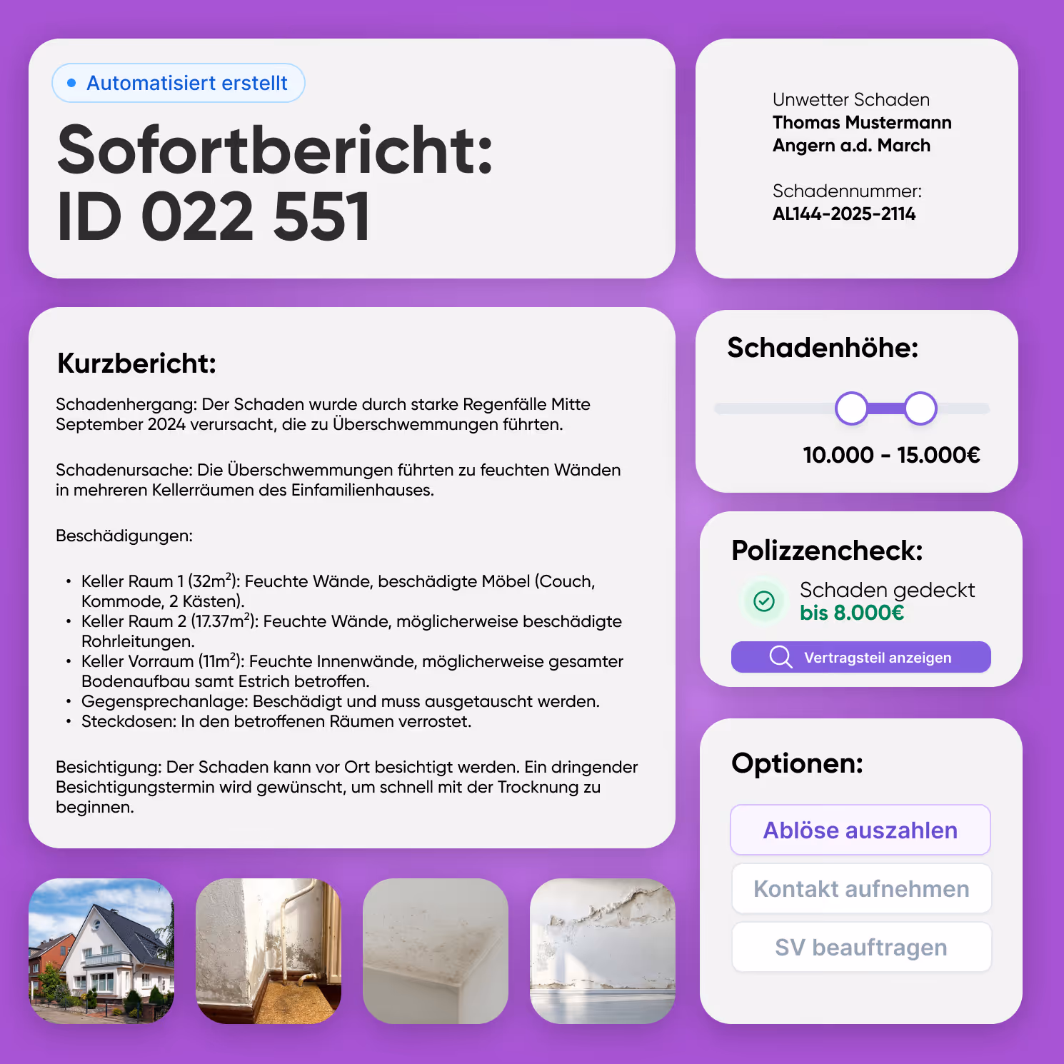 Policy check, damage assessment and instant report in minutes – for efficient settlement without delay.